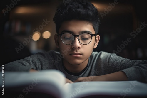 Young man with glasses reading a book in room, deeply focused on study.