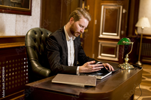 Young man working in the office with antique furniture