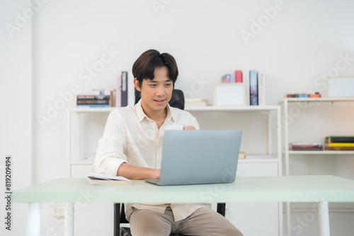 Young man working on laptop at home office