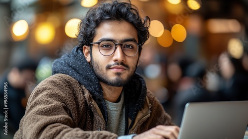Young Man Working on Laptop in Coffee Shop