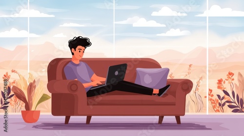 Young man working on laptop while relaxing on brown sofa in modern living room with scenic view