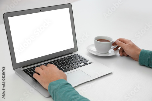Young man working with modern laptop at table, closeup. Mockup for design