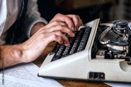 Young man's hands typing new book on an antique vintage typewriter, crop view