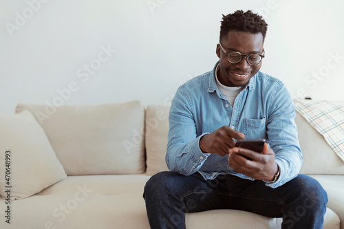 Young men using mobile phone. Close up of a man hand holding cellphone with internet browser on screen. Business, communication, technology concept. African guy working from home with cell phone.