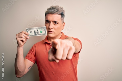 Young modern handsome man holding 1 USA banknote dollar over isolated white background pointing with finger to the camera and to you, hand sign, positive and confident gesture from the front