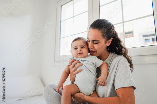 Young mom having fun with her son in bed at home - Childhood, love and family lifestyle concept - Main focus on mother face