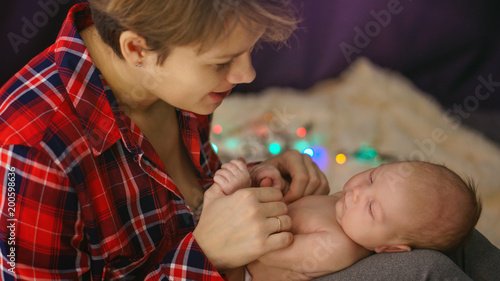 Young mother holding newborn daughter on her lap. Girl is dressed in a plaid shirt. Mother's love and care.