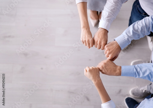 Young people in office wear putting hands together indoors. Unity concept