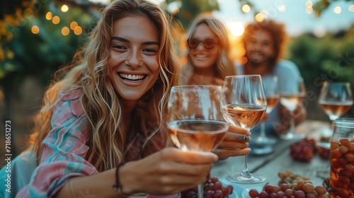 Young people sitting at bar table toasting wine glasses in vineyards garden