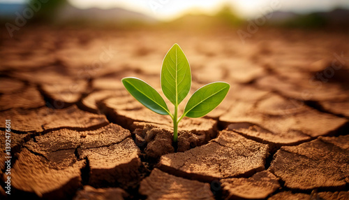 Young plant growing from cracked dry earth, concept of resilience, climate change, desertification awareness