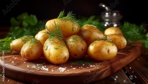 young potatoes seasoned with pepper and dill lying on wooden cutting board
