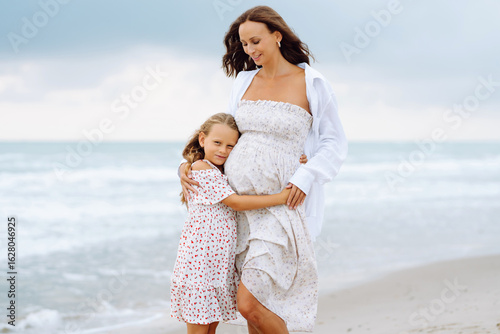 Young pregnant mother with daughter walking on sandy beach. Happy woman with child having fun and enjoying time together. Childhood, pregnancy and nature concept.