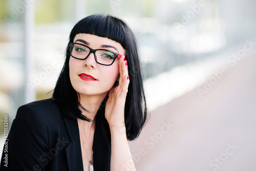 Young pretty girl dressed in a business suit and in the glasses with a suitcase talking on the phone and photographed