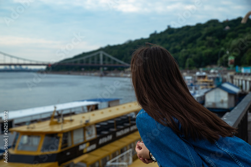 young pretty woman looking on river at morning time. boats in dock
