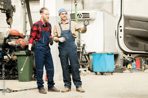 Young professional male car mechanics in uniform standing in repair shop, talking about work and smiling