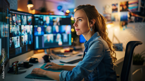 Young Professional Woman Using Dual Monitors for Multi-Team Video Conference, Modern Decor, High-Tech Office Setting, Virtual Collaboration