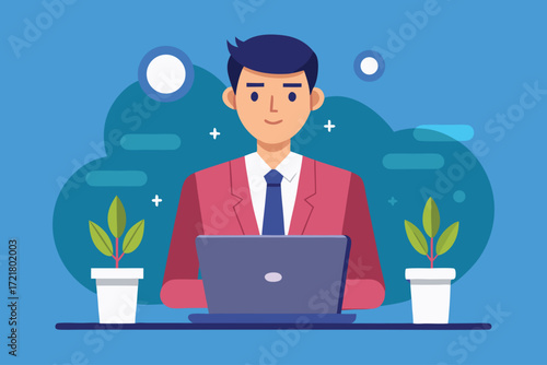 Young professional working on laptop in a bright and modern workspace with potted plants