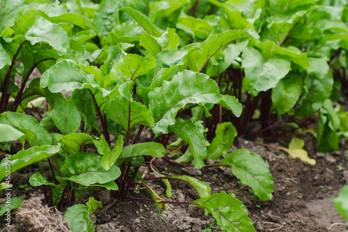 Young red table beet in a garden bed