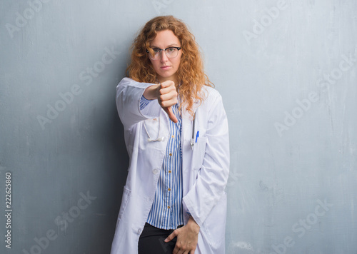 Young redhead doctor woman over grey grunge wall wearing a coat looking unhappy and angry showing rejection and negative with thumbs down gesture. Bad expression.