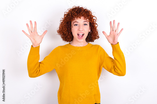 young redhead girl wearing yellow sweater over white background raising hands up, having eyes full of happiness rejoicing his great achievements. Achievement, success concept.