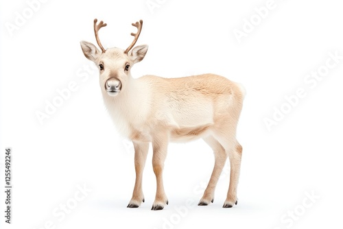 Young reindeer standing gracefully against a plain white background, showcasing its soft fur and antlers
