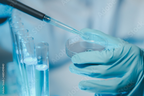 Young scientists in sterile clothing and safety goggles sitting at table conducting research investigations in a medical laboratory using a microscope, Serious concentrated female microbiologist.