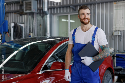 Young smiling male professional car mechanic man 20s wearing denim blue overalls white t-shirt gloves holding clipboard with papers document work in light modern vehicle repair shop workshop indoors