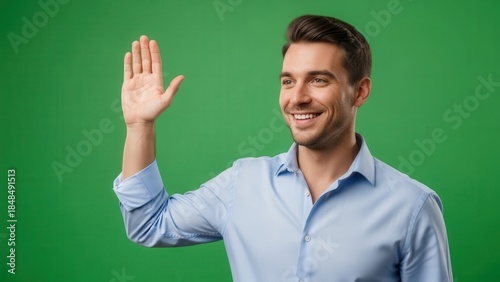Young smiling man with dark hair in light blue shirt waving against green screen background in