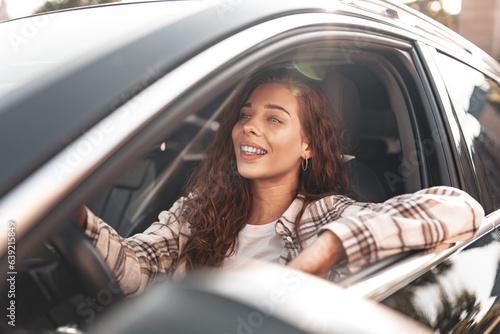 Young smiling woman driving a car in the city