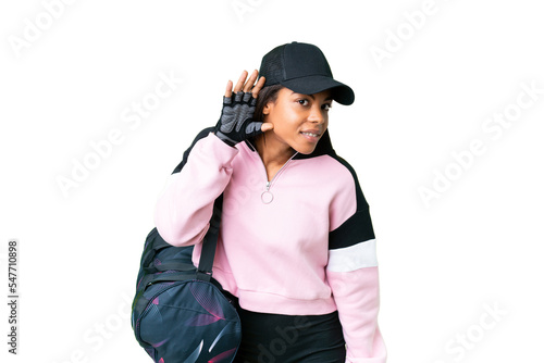 Young sport African American woman with sport bag over isolated chroma key background listening to something by putting hand on the ear