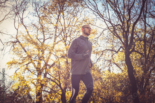 Young sports man running trough nature.