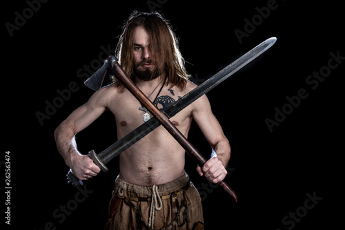 young strong long-haired bearded man with a tattoo and a sword and an ax of the Viking era looks forward