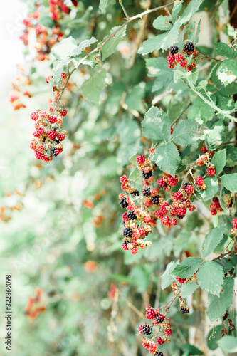 young unripe blackberries hang in clusters on a green Bush during the ripening period in summer