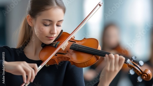 Young Violinist Playing Beautiful Melody in Bright Studio during Performance with Fellow Musicians