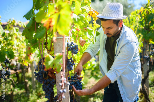 Young winemaker harvesting red grapes in autumn vineyard