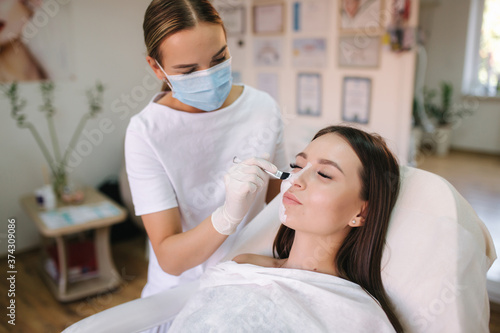 Young woman cosmetologist apply white clay mask on woman's face. Beautiful brunette woman in beauty salon