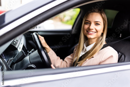 Young woman driving a car in the city. Portrait of a beautiful woman in a car, looking out of the window and smiling. Travel and vacations concepts
