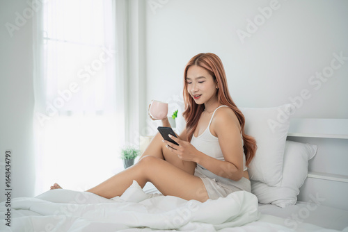 Young woman enjoying morning routine on bed with smartphone and coffee in bright, stylish bedroom, focusing on relaxation and comfort in home setting