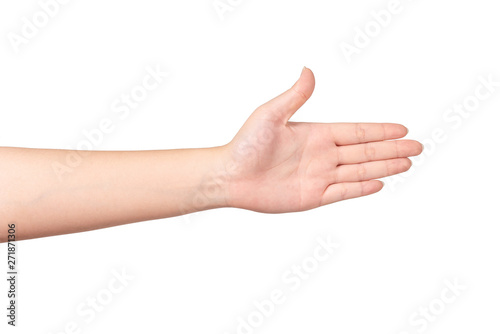 Young woman hand showing isolated on white background.