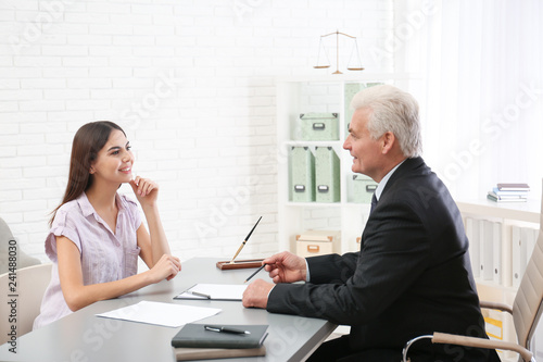 Young woman having meeting with lawyer in office