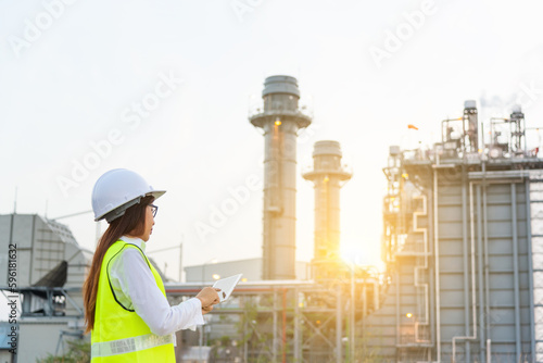 Young woman, he is an electrical engineer. inspecting power plant