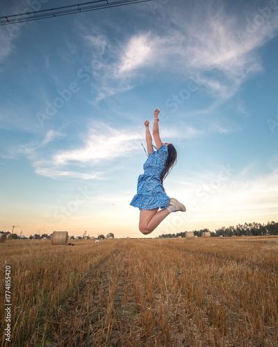 Young woman in a blue dress joyfully jumps in a golden field under a bright sky, capturing a moment of happiness and freedom in nature's beauty