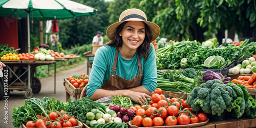 young woman in a straw hat, standing amidst a vibrant display of fresh produce. She is surrounded by an array of vegetables, including tomatoes and zucchini, all neatly arranged in crates