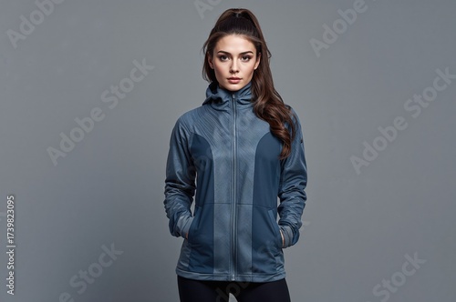 Young woman in athletic wear with long hair wearing a zippered sports jacket posing against a grey background showcasing fitness and active lifestyle themes
