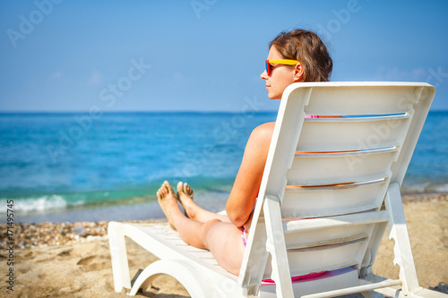 Young woman in chaise lounge at the sea beach. Girl relax on beach.