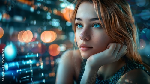 Young woman in her 20s reflecting on digital privacy concerns against a modern backdrop