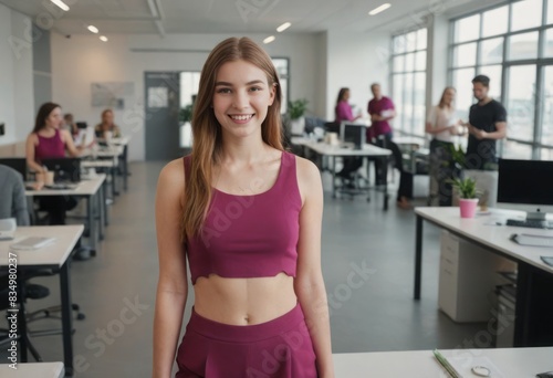 Young woman in sportswear at office. Healthy lifestyle and active work environment.