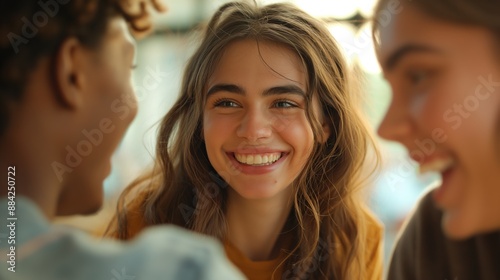 Young woman laughs and smiles among her friends outside in a social group event
