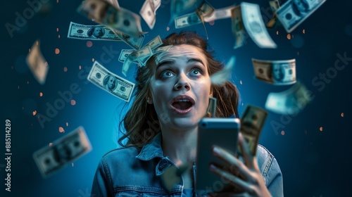 Young woman looks at a smartphone Dollar bills fly out of a smartphone happy and excited