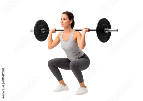 Young woman performing barbell squat exercise in gray fitness attire on transparent background, PNG